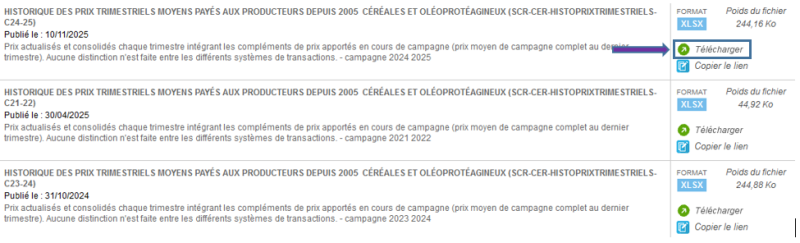 FranceAgrimer publie l’historique des prix moyens payés aux producteurs pour les céréales et les oléoprotéagineux au niveau national depuis 2005.